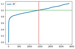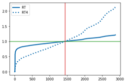 Bruk av tilgjengelighet til justering av fordelingsnøkkelen kan forklares med utgangspunkt i figurene over. Figur A viser et eksempel for et faktisk modellområde. Blå kurve (RT) viser relativ tilgjengelighet for grunnkretsene, sortert fra lav til høy. Relativ tilgjengelighet er etablert ved å dividere tilgjengelighet med median tilgjengelighet. Medianen er markert med rød linje, og for denne grunnkretsen er altså relativ tilgjengelighet lik 1.0, markert med grønn linje. Grunnkretser nede til venstre har RT<1.0 og kan bli «fratatt» noe av veksten de fikk i den første/foreløpige fordelingen av vekst. Grunnkretser oppe til høyre har RT>1.0 og kan bli tildelt mer vekst (opp til kapasiteten).