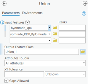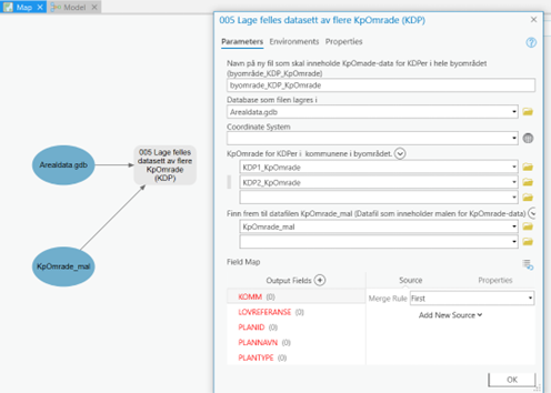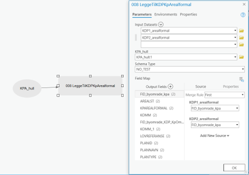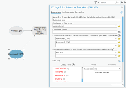 I dette trinnet skal det lages et felles datasett for KPA for kommunene som omfattes av byområdet. Før modellen kan kjøres må en undersøke om kolonnenavnene i attributtabellen til filene for KPA stemmer overens med det som er definert i filen KPA_mal:
