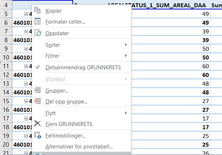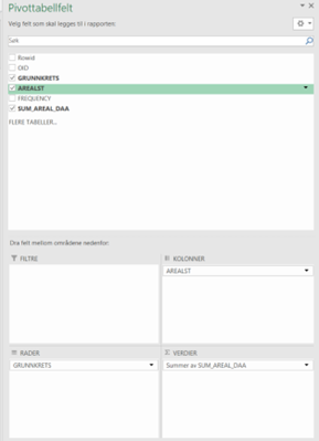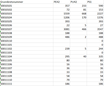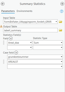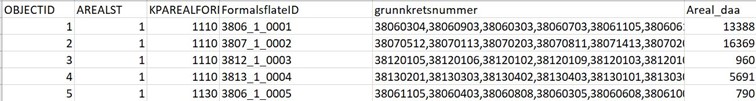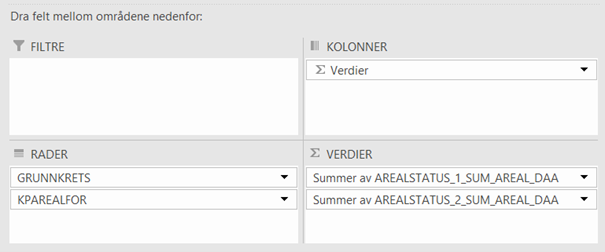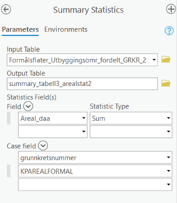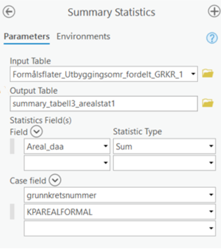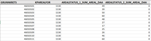I dette siste trinnet beregnes utbygd areal og fremtidig avsatt areal til utbygging per grunnkrets, uavhengig av arealformål. Dette eksporteres til en tabell, og den skal inneholde følgende informasjon: