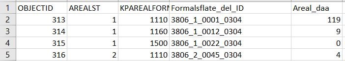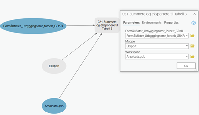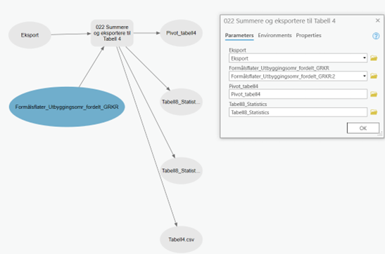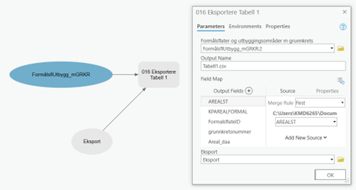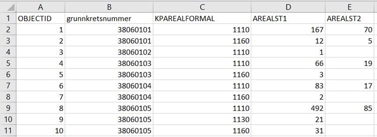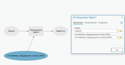 Basert på filen som ble opprettet i forrige trinn, "formålsflater_utbyggingsomr_fordelt_GRKR", opprettes og eksporteres tabell 2. Denne inneholder følgende egenskaper: