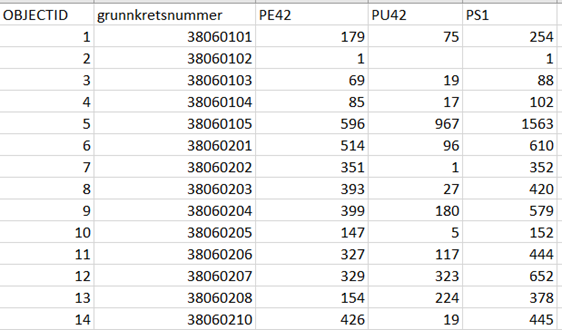 I dette trinnet beregnes arealet til polygoner med samme arealformål for både eksisterende bebyggelse (AREALST1 = 1) og fremtidige utbyggingsområder (AREALST = 2) for hver enkelt grunnkrets. Dette eksporteres til en tabell, og den skal inneholde følgende informasjon: