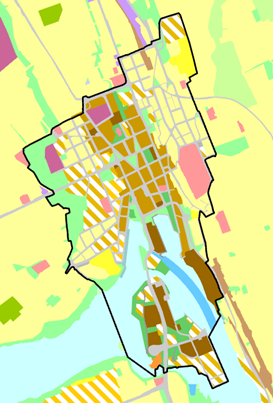 | Figur 2.1: Den nyere kommuneplanens arealdel for Skien kommune til venstre, og den eldre kommunedelplan for Skien sentrum til høyre (avgrenset av svart linje). Kommunedelplanen er mer detaljert og derfor lagt til grunn for arealdataverktøyet. | |