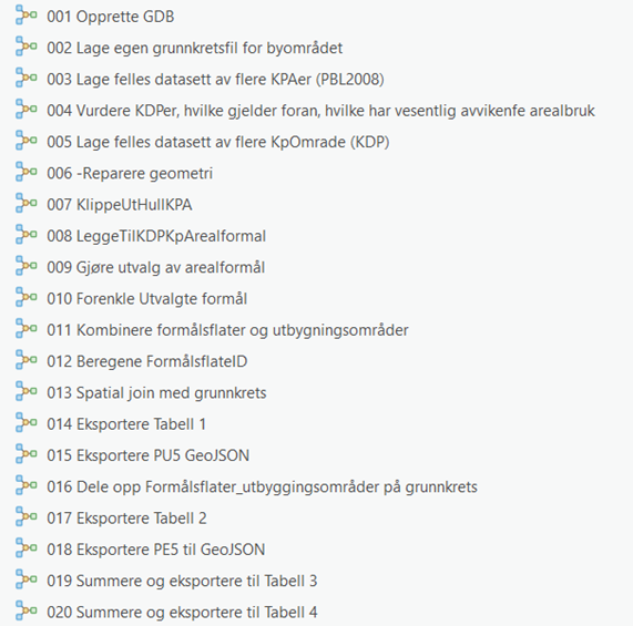 Prosessen med å bearbeide og hente ut data gjennomføres i 20 trinn, og er illustrert i figur 3.1. Det er blitt laget en egen verktøykasse for disse trinnene i ArcGIS. Hvert trinn inneholder en modell, som består av en eller flere verktøy som er koblet sammen og som automatisk produserer filer ved kjøring. Modellene er enkle å benytte, og krever ingen programmeringskunnskap. Alle som skal tilrettelegge data i et byområde får tilgang til denne verktøykassen. Denne verktøykassen ligger i geodatabasen "Arealdata", som ligger i filen du får tilsendt.