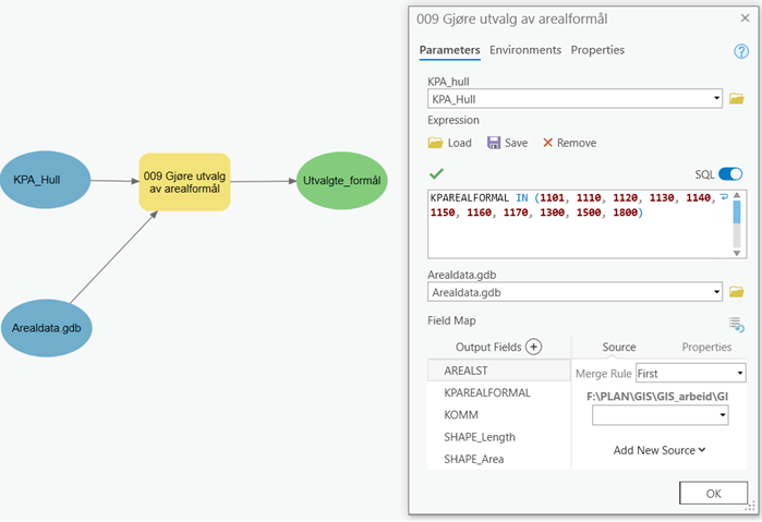 I verktøyet er det satt opp en spørring som henter ut disse formålene. Det eneste som det er behov for å gjøre i dette trinnet er å velge datasett som skal være input og det er filen laget i trinn 8 – KPA_hull. Hvis du ikke har lagt inn data for KDP, benytt filen "Byomrade_kpa" fra trinn 3. Sørg for at resultatet lagres i filgeodatabase "Arealdata".