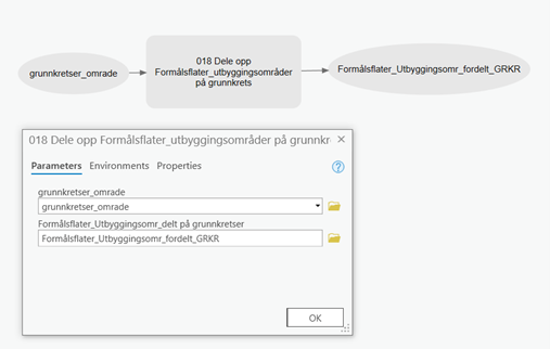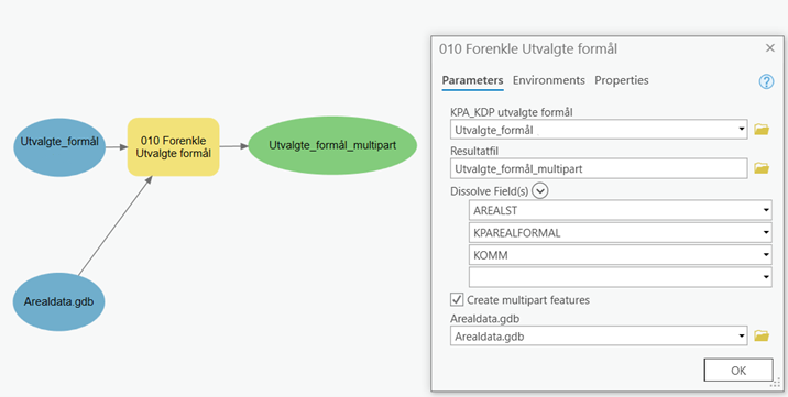 Det eneste man trenger å gjøre her er å benytte resultatet fra trinn 10, "Utvalgte_formål_multipart", som input og deretter vil modellen kjøre igjennom en rekke verktøy på egenhånd.