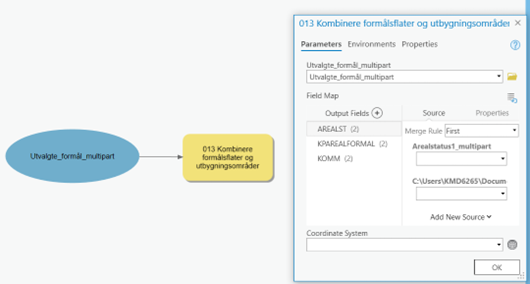 I modellen angis navnet på den nye filen, som inneholder KPA-data for hele byområdet, og skal få navnet "byomrade_KPA". I "KpArealFormalOmrade for de alle kommunen i byområdet" så skal datasettet for KPA for hver enkelt kommune i byområdet legges inn. Eksempelvis så vil man her for byområdet Grenland legge inn KPA for Porsgrunn og KPA for Skien. I figur 3.3 er det lagt til datasett for kommuneplanens arealdel for to kommuner.