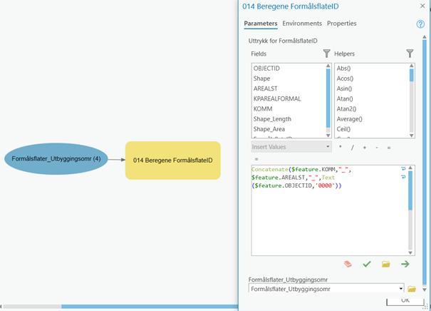 I dette trinnet får alle polygonene en unik ID, FormålsflateID. Se avsnitt 1.1.1 for oppsettet for dette ID-feltet. Det er satt opp et forhåndsdefinert uttrykk i verktøyet, og etter kjøring av verktøy skal halle polygoner ha fått tildelt ID.
