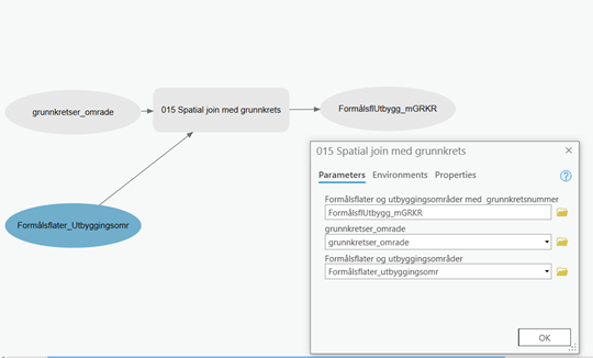 I trinn 13 gjøres det en overlagsanalyse mot grunnkretsfilen som ble opprettet i trinn 2. Mer spesifikt så benyttes verktøyet Spatial Join. Bakgrunnen for at dette gjøres er at man ønsker å kunne knytte polygonene som inneholder informasjon om arealformål opp mot grunnkrets. Som vist i figur 3.14 benyttes filen som inneholder alle grunnkretsene for byområdet, "grunnkrets_omrade" og resultatet fra trinn 12, formålsflater_utbyggingsomr, som input.