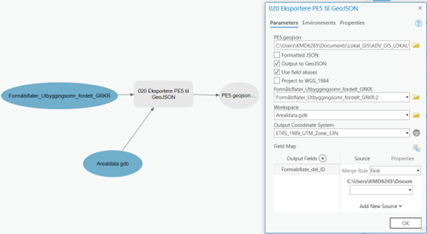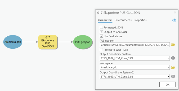 I trinn 15 blir polygoner med arealstatus = 2, det vil si utbyggingsområder i KPA/KDP, eksportert til filformatet GeoJSON. Filformatet brukes fordi ADV-løsningen er mer egnet for lesing av JSON-filer enn andre filformater. Når verktøyet, vist i figur 3.16, kjøres, blir det også gjort en forenkling av polygonene som eksporteres. Derfor vil geometrien til polygonene til resultatfilen fremstå som noe mer generalisert etter eksport. Før verktøyet kjøres må man endre på hvor GeoJSON-filen skal lagres. Opprett en ny mappe og kall den et fornuftig navn, for eksempel "GeoJSON". Velg denne mappen som lagringsområde under feltet "PU5.geojson", og gi den nye filen navnet "PU5".