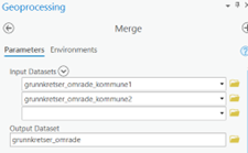 Benytt datasettet for grunnkretser, nevnt i avsnitt 2.1, til å lage et nytt datasett for grunnkretser som gjelder kun for byområdet. Hvis byområdet omfatter flere kommuner så må grunnkretsfilene for disse kommunene slås sammen. For dette trinnet er det ikke noe verktøy i modellen som benyttes, så dette må gjøres manuelt. I ArcGIS så benyttes verktøyet Merge for å gjøre dette, og figur 3.2 viser innstillinger for dette verktøyet. Sørg for at filen "Grunnkretser_omrade" lagres i geodatabasen "Arealdata"