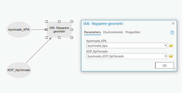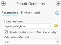 For å sikre at geometrien i filene som benyttes ikke inneholder feil, blir det for sikkerhetsskyld kjørt en reparering av geometri i dette trinnet. Dette vil fikse på eventuelle åpne polygoner og andre feil. Innstillingene for dette trinnet er vist i figur 3.5. Filen som ble opprettet i trinn 3 (Byomrade_KPA) og 5 (Byomrade_KDP_Omrade) benyttes som input.