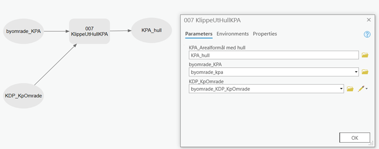 I figur 3.4 er innstillingene for dette trinnet vist i modellen. Den nye filen gis navnet "Byomrade_KDP_KpOmrade". I input for "KpOmrade for KDPer i kommunene i byområdet" legges til KpOmråde for alle KDPene som skal inkluderes. I dette tilfellet er det to KDPer som skal gjelde foran KPA, og vi legger derfor KpOmrade-filene for disse i denne inputen.